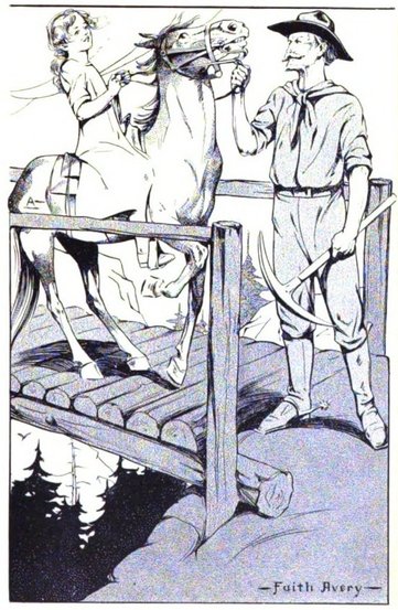 So Camp Expectancy it was, and the next one they found was so delightful that they decided it must be called Camp Delight. And the last camp was Camp Regret. Three nights they spent here, in the great, silent mountains. And three days of fishing in the clear mountain streams, and enjoying the freshly-cooked trout afterwards. Every day they had game of some sort, but no bear showed up, and the girls were secretly just as well pleased. These were happy, restful days. At first the constant riding in the saddle tired them in spite of their long practice, but the three days rest at Camp Regret fitted them for the home trip.