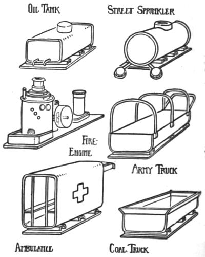 But, better still, working with the tin cans has developed the inventive faculties of my class to a surprising degree. The pupils have thought out and made many models of their own—not only toys but useful things as well. Various members of the class investigated the large trucks, automobiles, hoisting engines, locomotives, boats and such things seen in[3] any water-front community, to see how they were made and how they worked, and why. These pupils then returned to the school shops and made models of their own, many of which showed considerable invention and ingenuity.