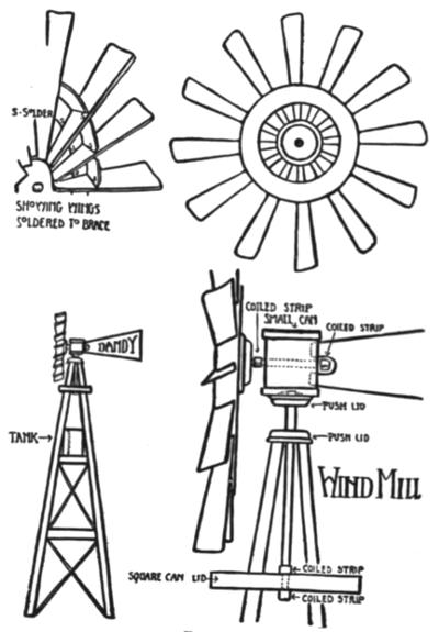 A Windmill and Tower.—A windmill and tower that will look very realistic when completed may be made from tin cans. The vane wheel is composed of twelve blades set in two can lids. The vanes are cut from a flat piece of tin, care being taken to make each one exactly the same size. A large can lid is used for the outer vane support and the central part of this lid is cut away. Twelve cuts are made around the edge of the can lid at equal distances and the vanes soldered in these cuts.