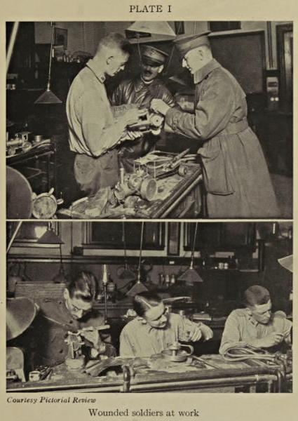 “For the officers’ wards, barracks, and recreation hut, we made tin candlesticks, flower holders, ash trays, electric light shades, tea trays, desk sets, and filing boxes. All of which were not only useful but quite ornamental, as they were attractively painted and decorated by the patients. The soldiers took great interest in the making of mechanical toys, especially war-like ones, such as tanks, aeroplanes, cannon and army trucks.
