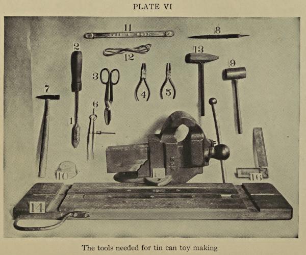 But the making of tin can toys is by no means limited to hospitals and schools. Any one who cares to tinker, to handle tools, to use up waste materials, may find pleasure and profit from assembling tin cans and parts of them. Many useful and attractive things may be made for the home, shop, or camp.