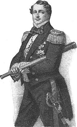 Als der Pulverrauch sich verzogen hatte, stand der Führer, gestützt auf das Geländer, wieder aufgerichtet da und rief dem Steuermann zu: „Das linke Bein ist zerschossen; hier ist mein Taschentuch, schnüren Sie es über die Wunde fest um das Bein!“