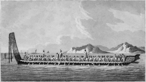 In the afternoon, when Mr. Banks was out in the boat a shooting, we saw with our glasses four double canoes, having on board fifty-seven men, put off from that shore, and make towards him; we immediately made signals for him to come on board; but the ship, with respect to him, being right in the wake of the sun, he did not see them. We were at a considerable distance from the shore, and he was at a considerable distance from the ship, which was between him and the shore; so that, it being a dead calm, I began to be in some pain for him, fearing that he might not see the canoes time enough to reach the ship before they should get up with him: soon after, however, we saw his boat in motion, and had the pleasure to take him on board before the Indians came up, who probably had not seen him, as their attention seemed to be wholly fixed upon the ship. They came within about a stone’s cast, and then stopped, gazing at us with a look of vacant astonishment: Tupia exerted all his eloquence to prevail upon them to come nearer, but without any effect. After surveying us for some time, they left us, and made towards the shore; but had not measured more than half the distance between that and the ship before it was dark. We imagined that these people had heard nothing of us, and could not but remark the different behaviour and dispositions of the inhabitants of the different parts of this coast upon their first approaching the vessel. These kept aloof with a mixture of timidity and wonder; 4others had immediately commenced hostilities, by pelting us with stones: the gentleman whom we had found alone, fishing in his boat, seemed to think us entirely unworthy of his notice; and some, almost without invitation, had come on board with an air of perfect confidence and good-will. From the behaviour of our last visitors, I gave the land from which they had put off, and which, as I have before observed, had the appearance of an island, the name of Lookers-on.