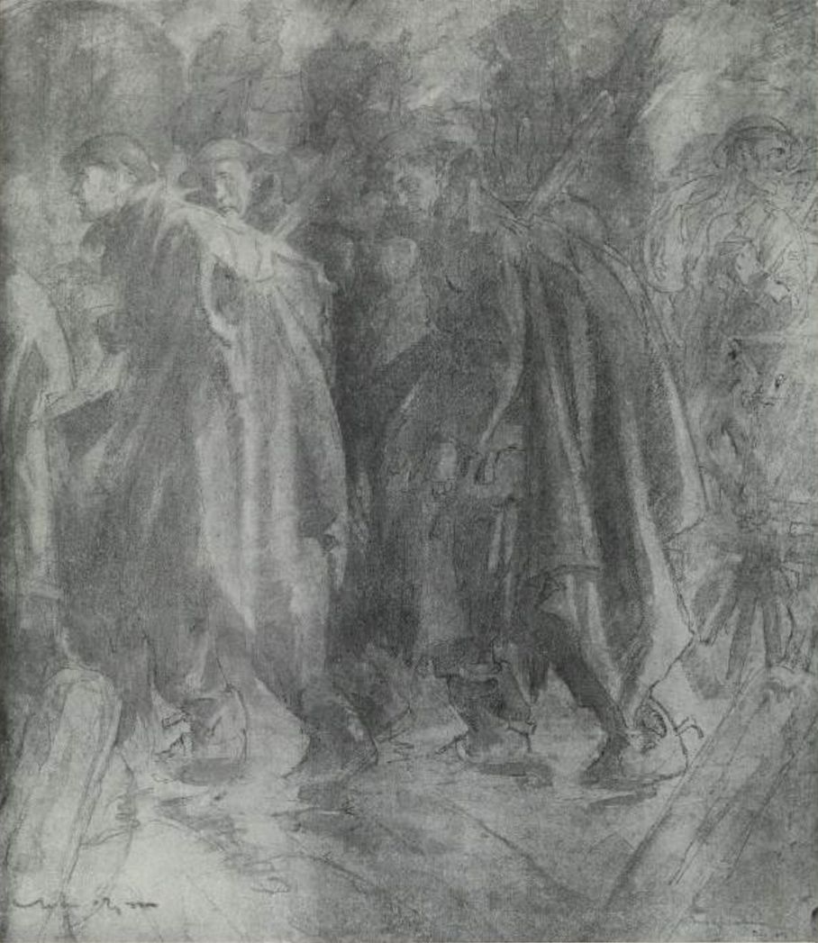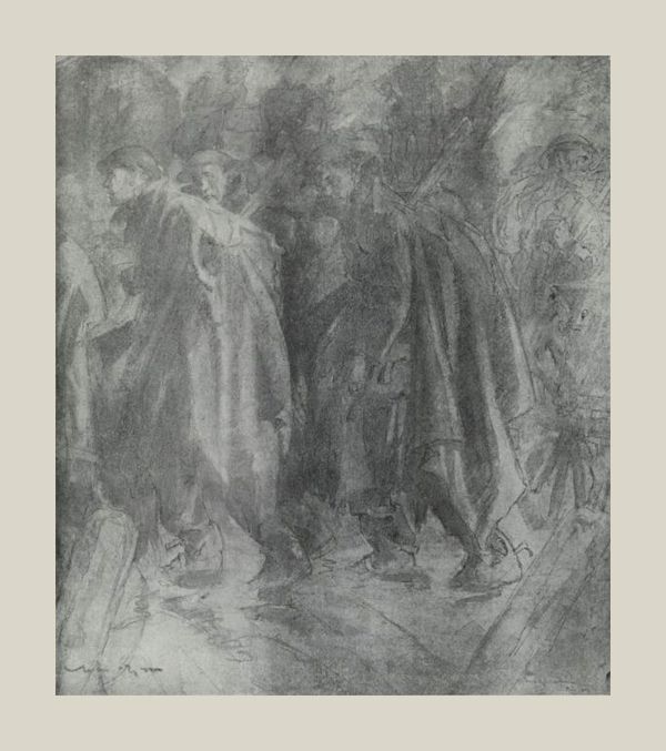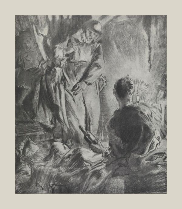 In any case the lightest, wildest or even crudest sketch scratched down by Dyson has always had more of the true grip of gravity than the whole of the Royal Academy. It is our modern misfortune that what is most solemn is most frivolous; because it is, in motive if not in method, most facile. There is always genuine thought in the design as well as the detail of Mr. Dyson’s work; and it is thought of a kind that is too little defined or understood. Where he has always differed from a common capable caricaturist is approximately in this; that it was never the comic but rather the serious feature that he caricatured. It is the soul rather than the body that he has drawn out in long fantastic lines. His comedy has never been merely comic, but rather philosophic and poetic. When he drew a Jew he did not merely draw the nose of a Jew, as a man might draw the trunk of an elephant; the most prominent thing about an elephant but not the most elephantine. He would rather draw that oriental type of eye, so strange in its shape and setting; which can be seen carved on colossal Assyrian masks of stone or painted flat on the cases of Egyptian mummies. And this marks his philosophic sentiment; he throws on things a new light which is also an ancient light; which is in its nature historic and even pre-historic. This is what links him up with the school of the great satirists; for it is one of the chief strokes of satire to tell new things that they are old; nay, in a sense to extinguish them by telling them they are eternal. But there is necessarily the same sort of epic symbolism underlying his treatment of the toils and perils he most sincerely admires, as underlying his treatment of the luxury and tyranny he has most drastically denounced or exposed. And that is why something of this almost allegoric spirit must be appreciated, in appreciating his studies of the appalling pageant of the great war.