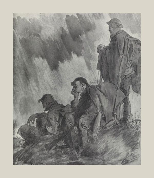 We are fighting against a living slime, like that mud of Flanders which men loathe more than wounds and death. And indeed the two spirits of the war might be conceived as meeting in the flats of the Flemish coast under the emblems of the two elements; the strange slow strength of the inland swamp and the force and freedom of the sea. Against such elemental emptiness of bare lands and bleak waters. Dyson has moved and showed his comrades moving; and his stroke is here none the less militant because he is now using only the artillery of art, which fights not with fire but with light.
