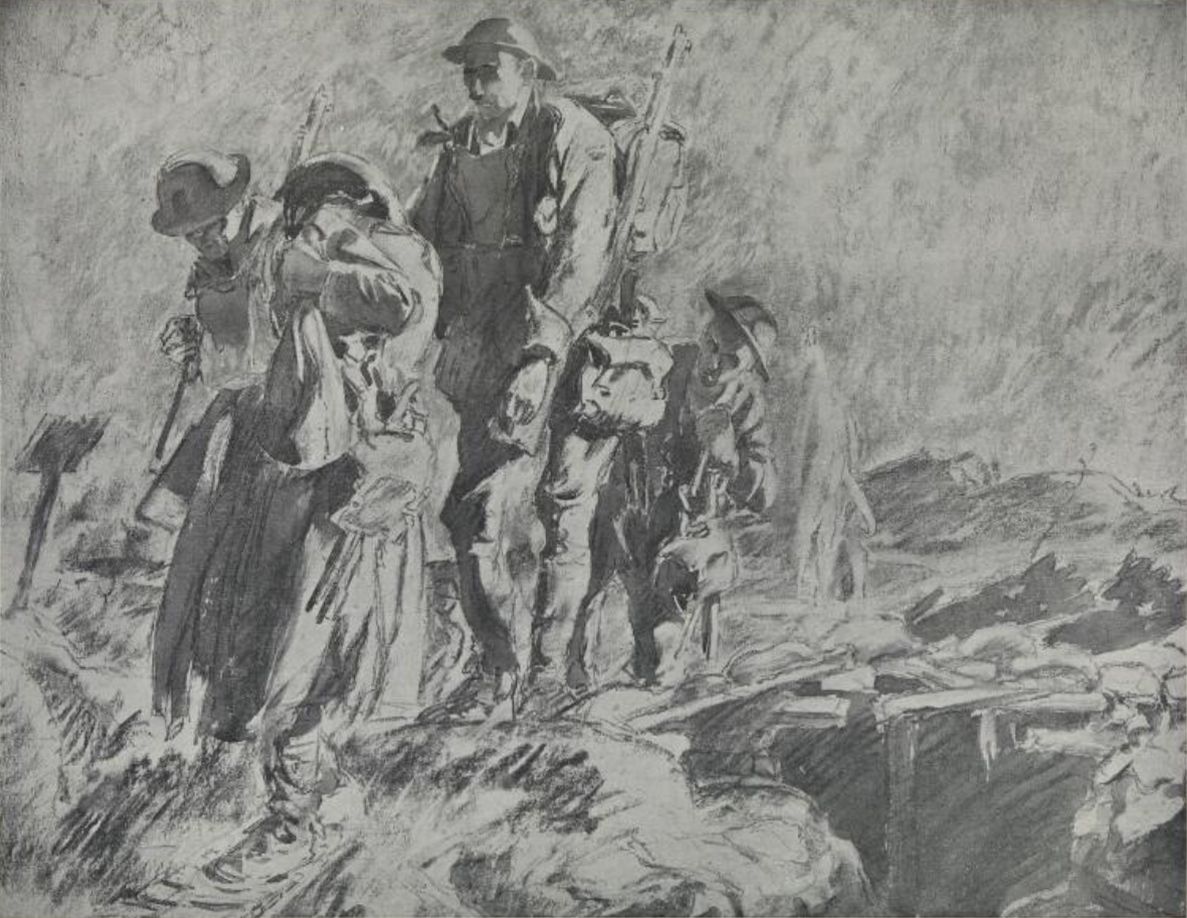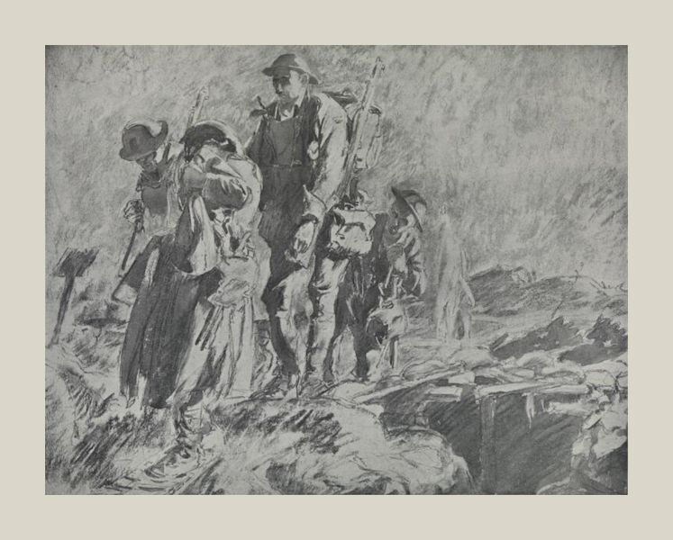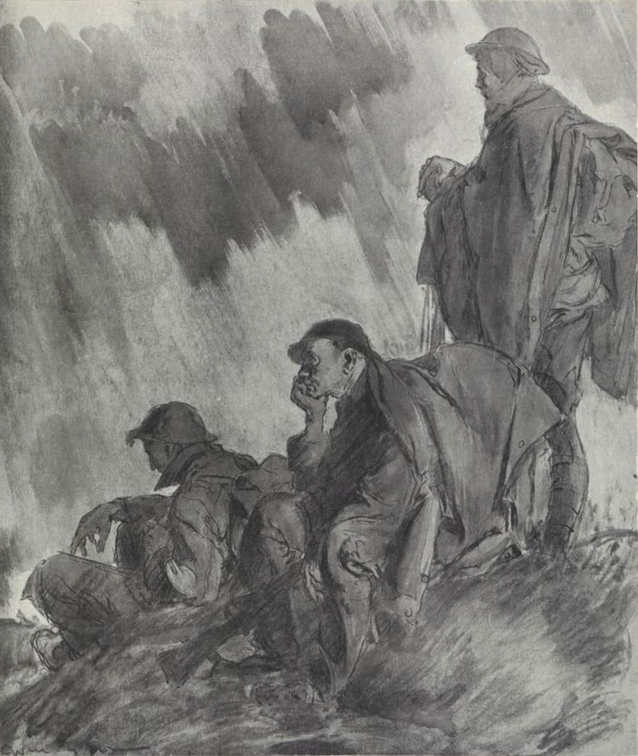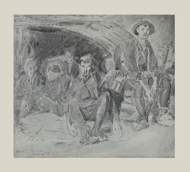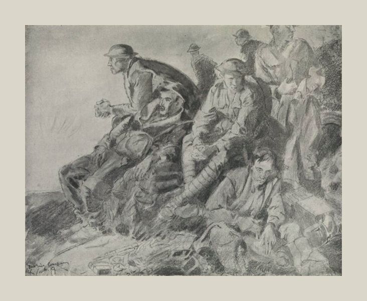 “One so often sees them—these seemingly purposeless groups, awaiting events with the grim immobility of Sioux braves . . . . doing nothing in places where no man would be for choice. Stretcher bearers they may be, or runners, or a company that has left the sickly foetid odours of the dug outs—reminiscent of fowl houses and tramps in summer—to make room for the relief, and is now standing by in all the taciturn boredom of that condition—silent men whom you pass, with all their taciturnity, with the feeling that they have passed a verdict on you annihilating in its justice. . . . .
