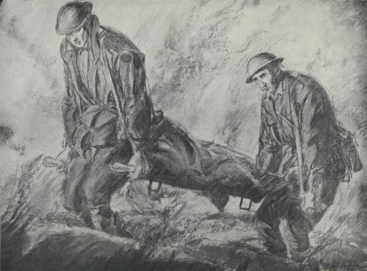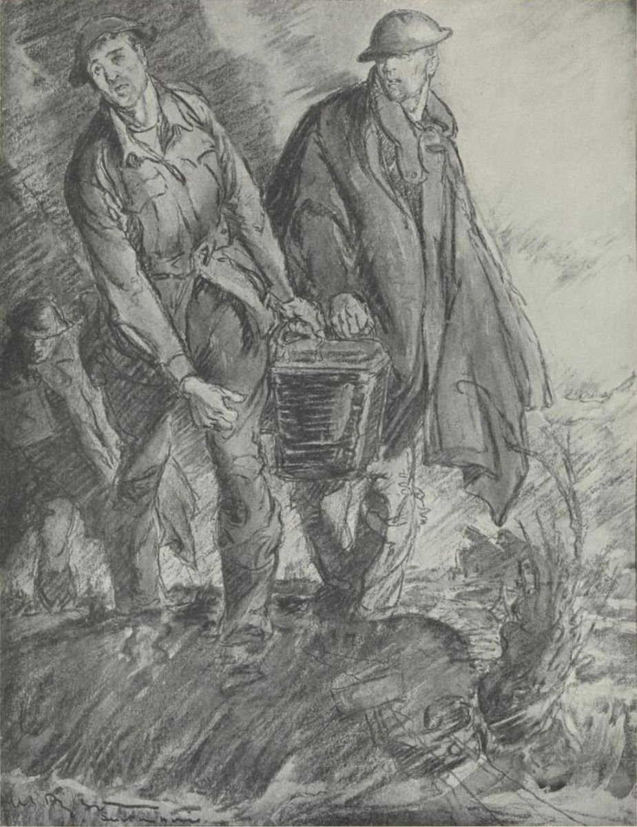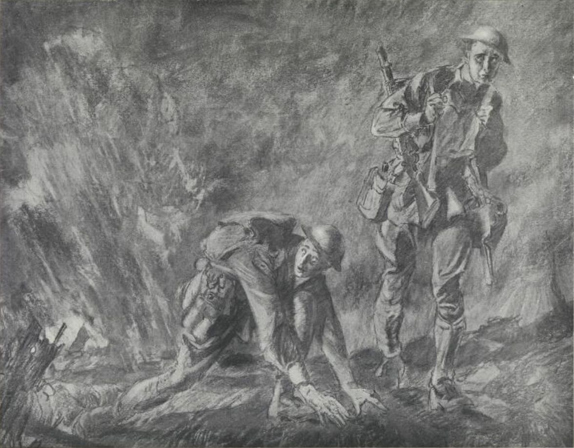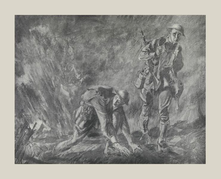“They move with their stretchers like boats on a slowly tossing sea, rising and falling with the shell riven contours of what was yesterday no man’s land, slipping, sliding, with heels worn raw by the downward suck of the Somme mud. Slow and terribly sure through and over everything, like things that have got neither eyes to see terrible things nor ears to heed them . . . . The fountains that sprout roaring at their feet fall back to the earth in a lace-work of fragments—the smoke clears and they, momentarily obscured, are again moving on as they were moving on before: a piece of mechanism guiltless of the weaknesses of weak flesh, one might say. But to say this is to rob their heroism of its due—of the credit that goes to inclinations conquered and panics subdued down in the privacy of the soul. It is to make their heroism look like a thing they find easy. No man of woman born could find it that. These men and all the men precipitated into the liquescent world of the line are not heroes from choice—they are heroes because someone has got to be heroic. It is to add insult to the injury of this world war to say that the men fighting it find it agreeable or go into it with light hearts.”