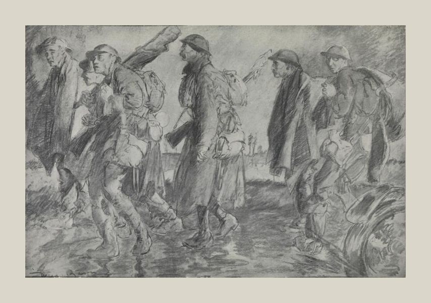 “From rail heads and the tender mercies of R.T.O’s., they move over France through villages, and over what were villages—over duck boards and shell holes with that grousing league-devouring indifference to all things made which is bred by a life two-thirds of the activity of which is moving from a place you don’t want to be in to a place you don’t want to go to.”