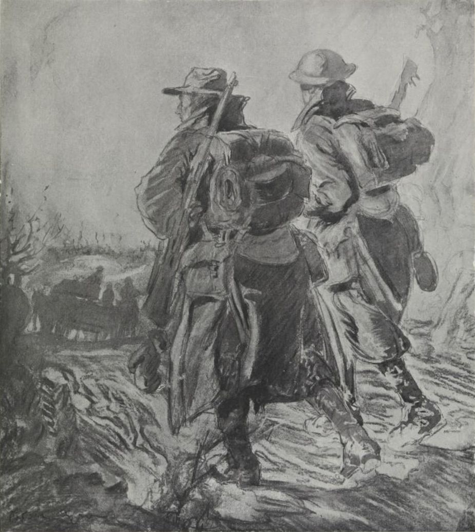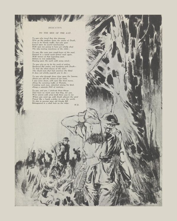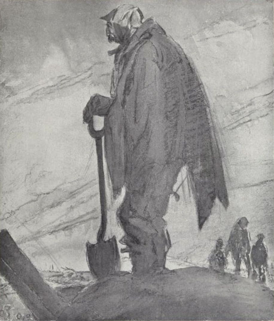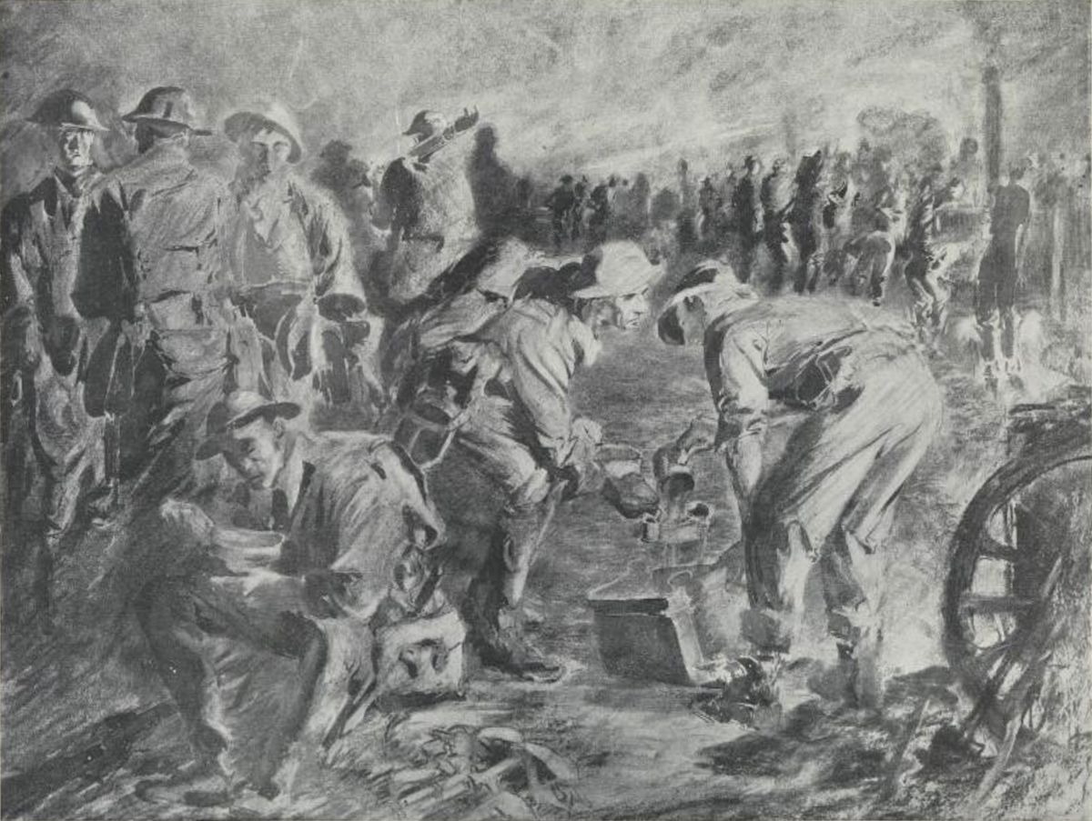 “Little groups of men burdened with the appliances of their trades file slowly across the hummocks of Flanders mud. They come out of endless holes and go into endless holes like lonely ants bent on some ant-like service. . . . . Ant-like in the distance, they loom upon a nearer vision things elemental and Homeric, big with destiny. They are merely soldiers at the base, perhaps shopmen at Brisbane, but they are things of mystery in the line. I feel that here all soldiers of all ranks tend to have the baffling profundity of the peasant, that sense of the nearness to the beginning of things which makes the artist see in the peasant the simple, unsolvable mystery of life reduced to its least common multiple—man shorn of all his vast cultures, which are not mysterious, and left simple man, which is.”