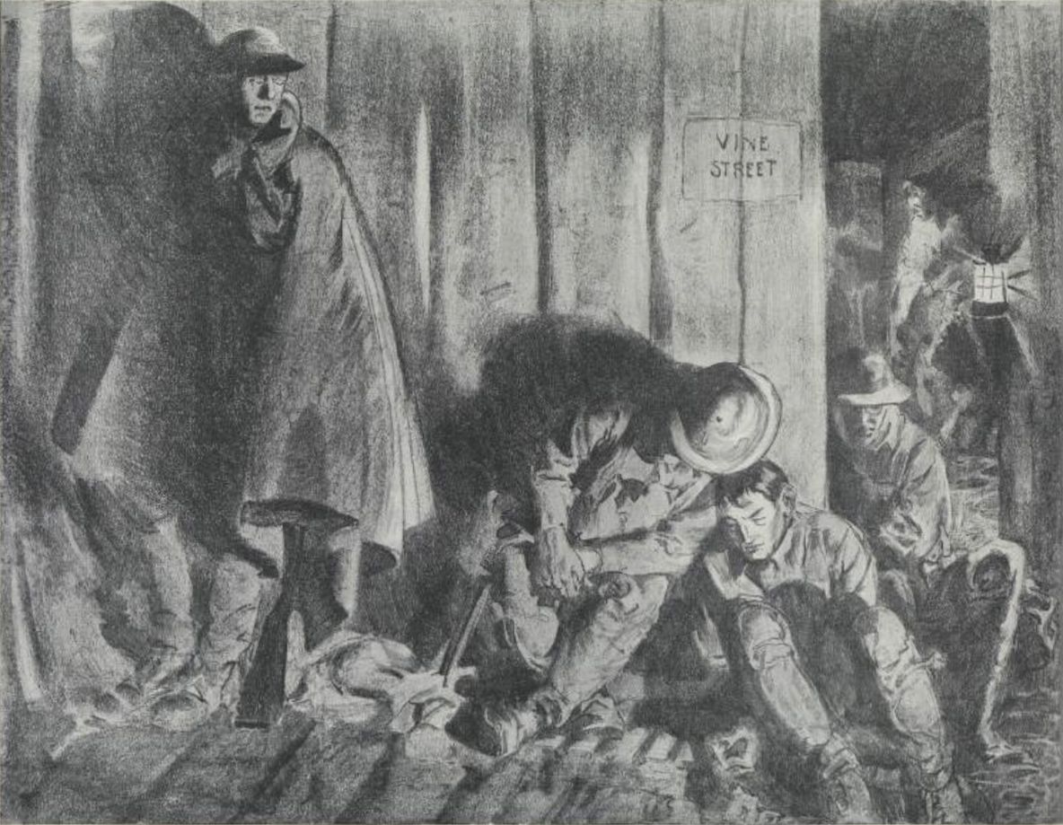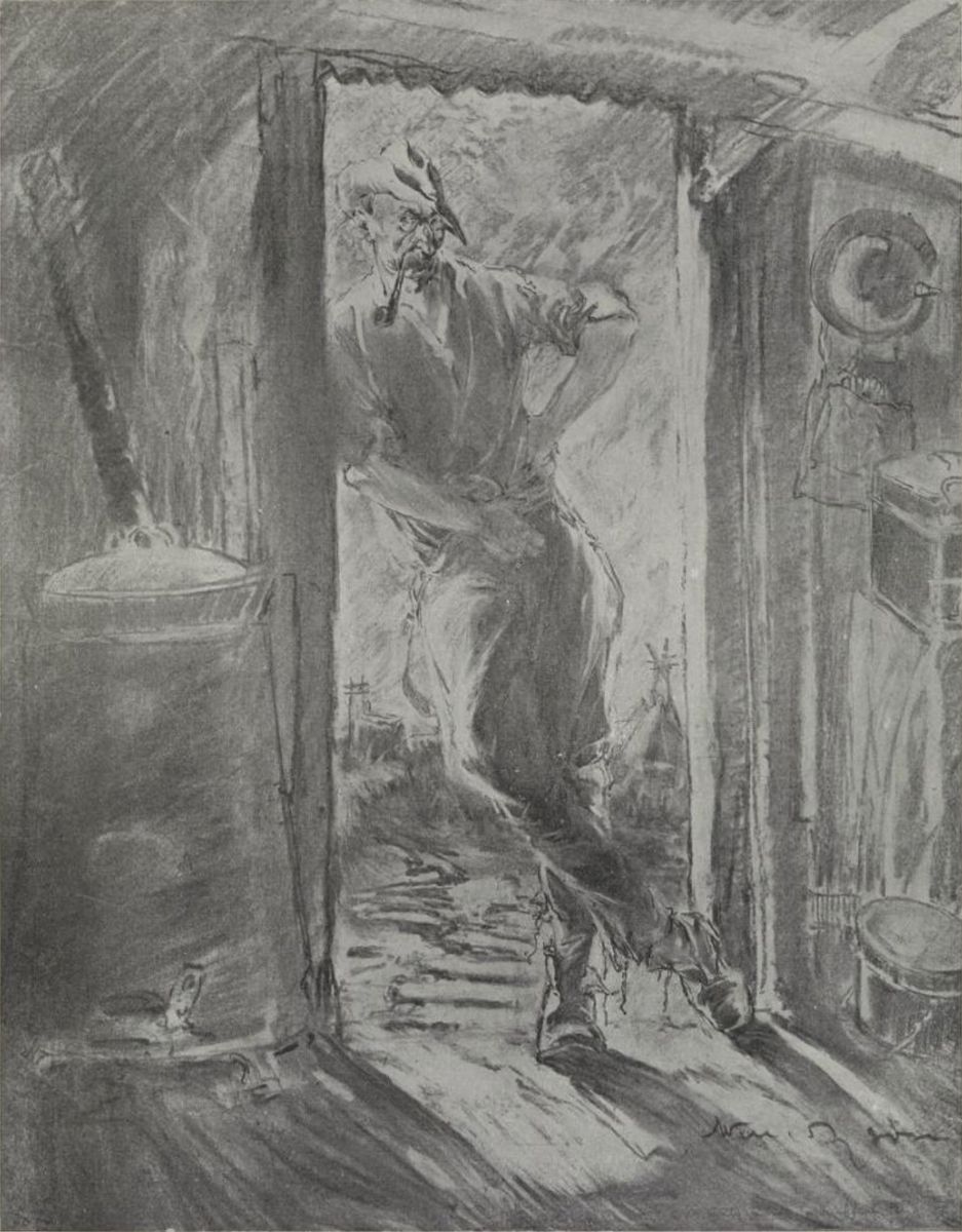 “. . . all with a tendency to group about in the sociable area of the cookers where they stood, dropping brief words in confirmation of the narratives of the garrulous few, weary to exhaustion, eager for food and for rest, but for the while content with the negative joys of being merely out of it.