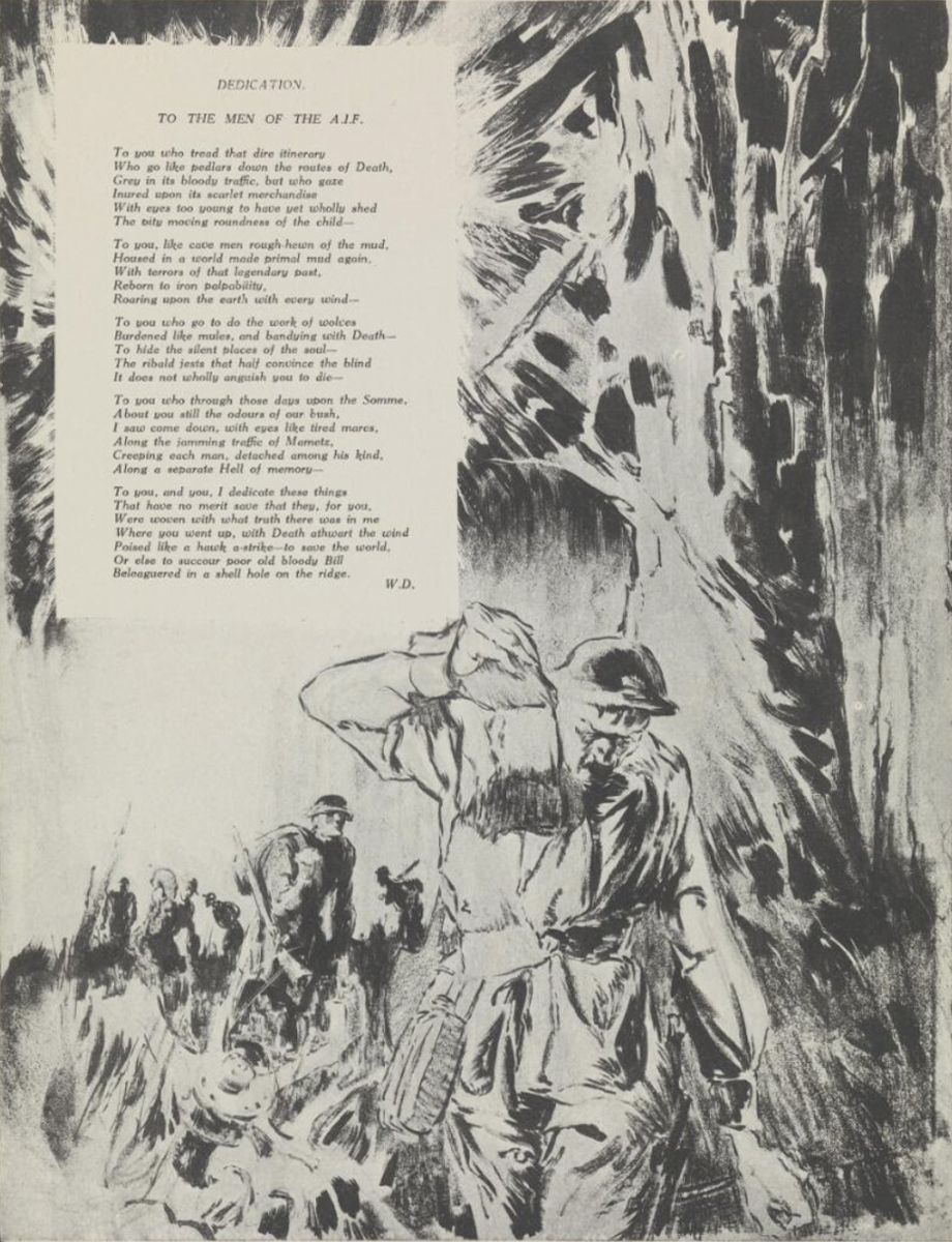 “I started to do a drawing for a Christmas Card for the battalion, representing some of the boys thinking of Australian summer, in the mud of this Flanders winter, but the thing was a little too funereal to force on fighting men. I did them one dwelling more on the light and gamesome aspects of a life of slush, sandbags, shells and sacrifice. . . . The passion of soldiers for amusing drawings of the front is a different thing to the civilians demand for them. . . . . It is a proper and wise attitude for the soldier to take towards his hardships, but for the others to be so preoccupied with discovering the humours of the soldier’s lot is scarcely seemly.”