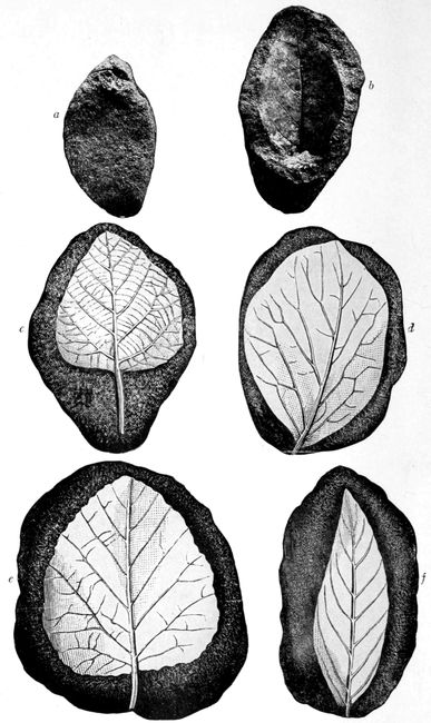 | Fossil Leaves. a, Unopened Leaf Nodule. b, Nodule opened to show fossil leaf. c, d, e, f, Various forms of fossil leaves | 21 |