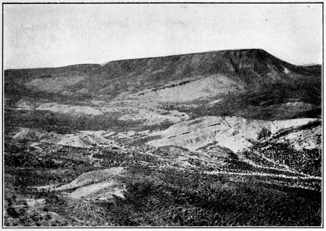 There are two distinct formations in the Permian of this part of Texas which give character to the surface of the country. They are as different as if separated by hundreds of miles. I visited one locality on Pony Creek, where the red beds lay on top of the gray beds conformably. Looking to the west, a vast panorama, desolate and forlorn, of crumbling and denuded bluffs, narrow valleys, and beetling crags, spread out before me, with the usual red color dominant everywhere, its monotony relieved only here and there by the green of some stunted mesquite or patch of grass. To the east stretched the narrow valley of Pony Creek, whose topography is the same as that which is so familiar to the residents of eastern Kansas—a ledge of gray sandstone forming a narrow escarpment on either side and following the trend of the hills around the ravines, with grass coming down in gentle swells to meet it or rising to it from the bottom lands below. The greatest thickness of this sandstone, as I observed it, was at the head of a narrow gulch near my 262camp in the creek bottom, eight miles north of Seymour. I made a section there and sent samples of the rock to Munich.