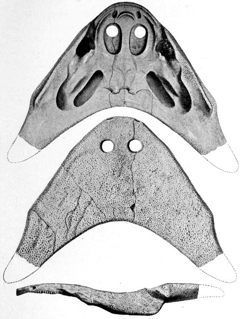 This was a fully matured animal. As the bony ossicles of the head armature are co-ossified with the margin and remain as undulations more or less sharply defined, I am inclined to believe that they are ornaments. They might assist a little in defense but not offense.