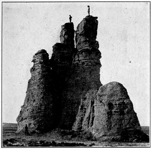 Fig. 38.—Niobrara Group, Cretaceous chalk with cap rock of Loup Fork Tertiary, known as Castle Rock, Gove Co., Kansas. (Photo, by McClung.)