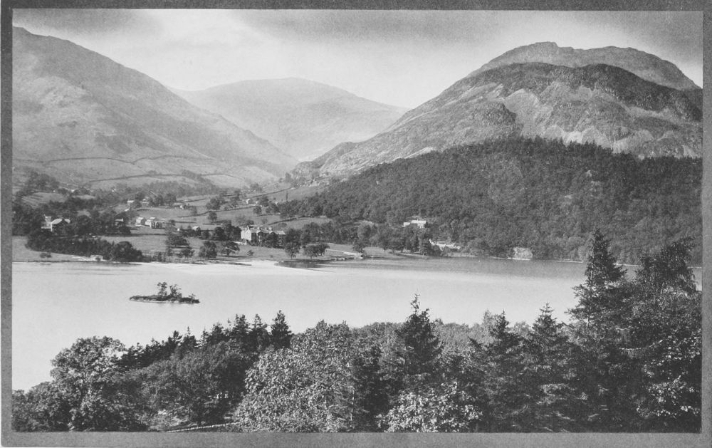 As we sail up from the foot of the lake there is ever present the feeling that we are working up to a climax, and this is attained when the top reach bursts on our view in a way that is quite dramatic and which exceeds our most sanguine expectations. The richly wooded slopes on our right descend to the water’s edge, whilst above they merge into the craggy fellsides, in many places overgrown by purple heather and golden bracken, with sombre Scotch firs interspersed in lavish style. Beyond this front array stretches the long, lean flank of Helvellyn, glimpses of which are caught away at the heads of all the side valleys. In front of us the fine sweep of St. Sunday’s Crag, one of the most perfect{40} outlines in the district, forms a centre-piece. Its beautiful curve sweeps gracefully down towards the Grisedale Valley, like a high-born lady acknowledging the existence of a humbler presence. Further round still is the deep valley of Kirkstone, bounded on the left again by the High Street range and its dependencies. Place Fell—variegated with masses of dark gorse and crag, but almost devoid of trees—fills in the scene on the left, an excellent foil to the luxuriance which is the dominant note of the opposite shore.
