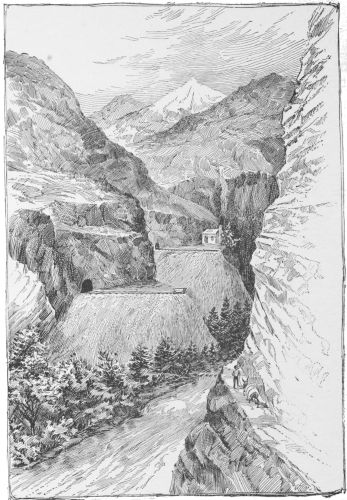 Beyond the woods the party found itself on the brink of a deep gorge, at the bottom of which Panther Creek tore down in a series of cascades. The torrent ran four or{10} five hundred feet below, and above them the mountains rose to invisible heights. Along this cliff-face the narrow trail had been carried irregularly and often very dangerously, but the hardy little beasts picked their way cautiously up and down, and never sank too deep in a bog or got too far over the edge of a precipice.
