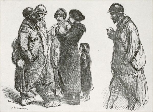De ces ouvriers, Steinlen nous montre à peine les outils. Il a vraiment rompu avec toutes les traditions de cette «peinture militaire» dont je parlais. Pas de canons, pas de fusils, pas d’équipements, aucun décor précis; l’artiste est allé au front, il n’en a retenu que les pensées inspirées par les spectacles. Des hommes, des femmes, des enfants, avec le moins de détails guerriers que possible: l’homme est casqué, on devine sa capote contre laquelle il a troqué sa blouse, et quelques accessoires de son fourniment. Rien de plus. L’intérêt n’est pas là. Il est tout entier dans les visages et les attitudes, qui suffisent à exprimer tout le pathétique de ces années.