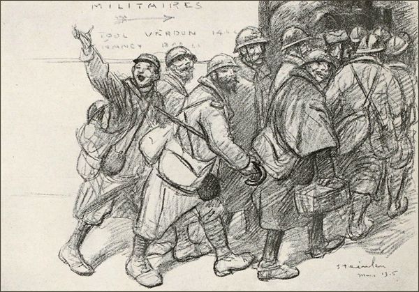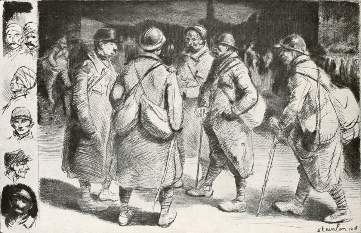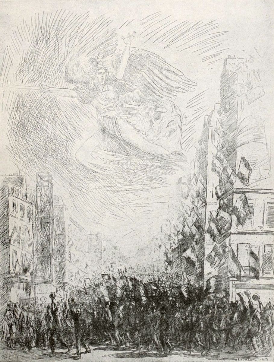 Steinlen a intitulé une de ses séries de dessins: Les Ouvriers de la Guerre. Cela est typique. Cela définit bien ce qu’est pour nous tous cette lutte: un travail, plus important que tous les autres travaux qu’il nous a fait délaisser, une entreprise collective de démolition d’un système d’idées monstrueuses, coûte que coûte, avant la reconstruction possible—l’immense déblai de l’avalanche barbare écroulée au milieu de la civilisation.
