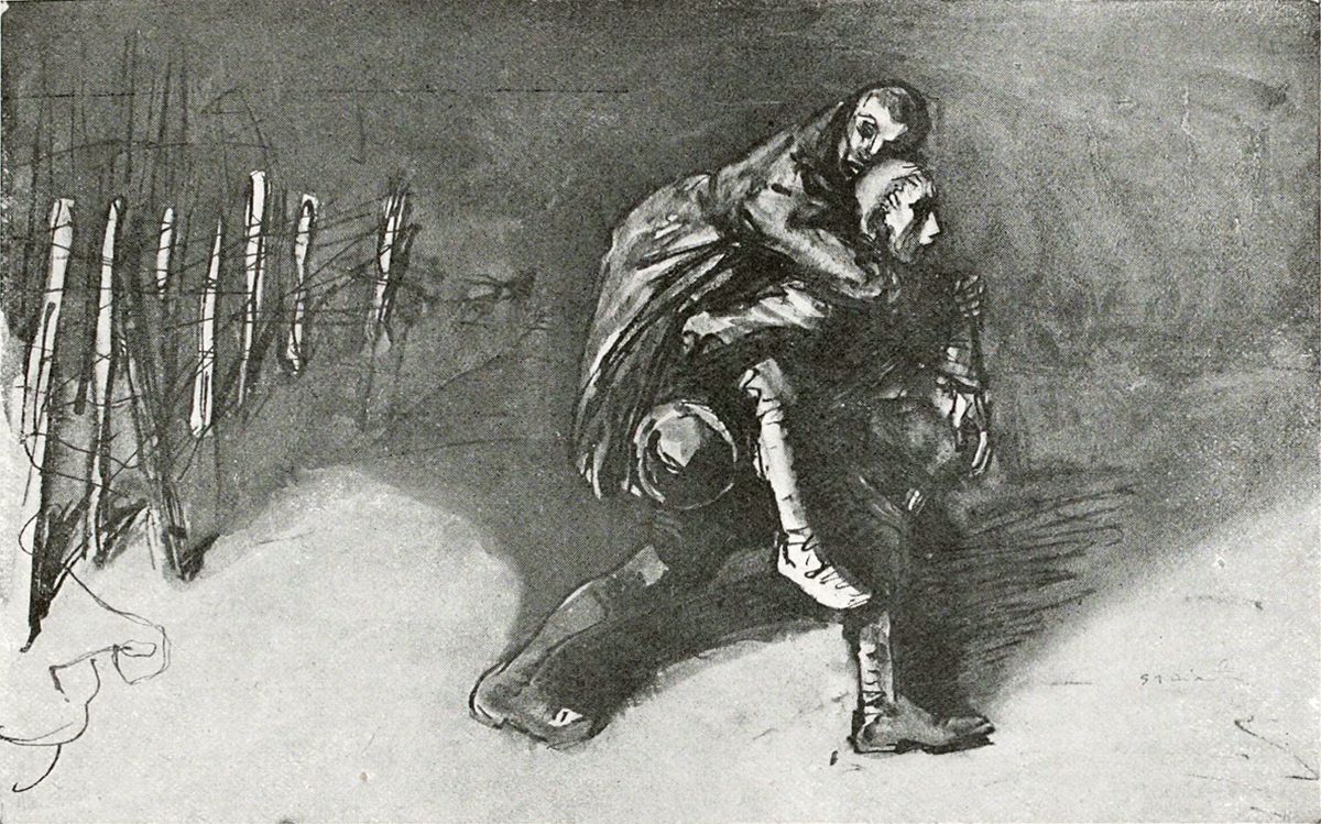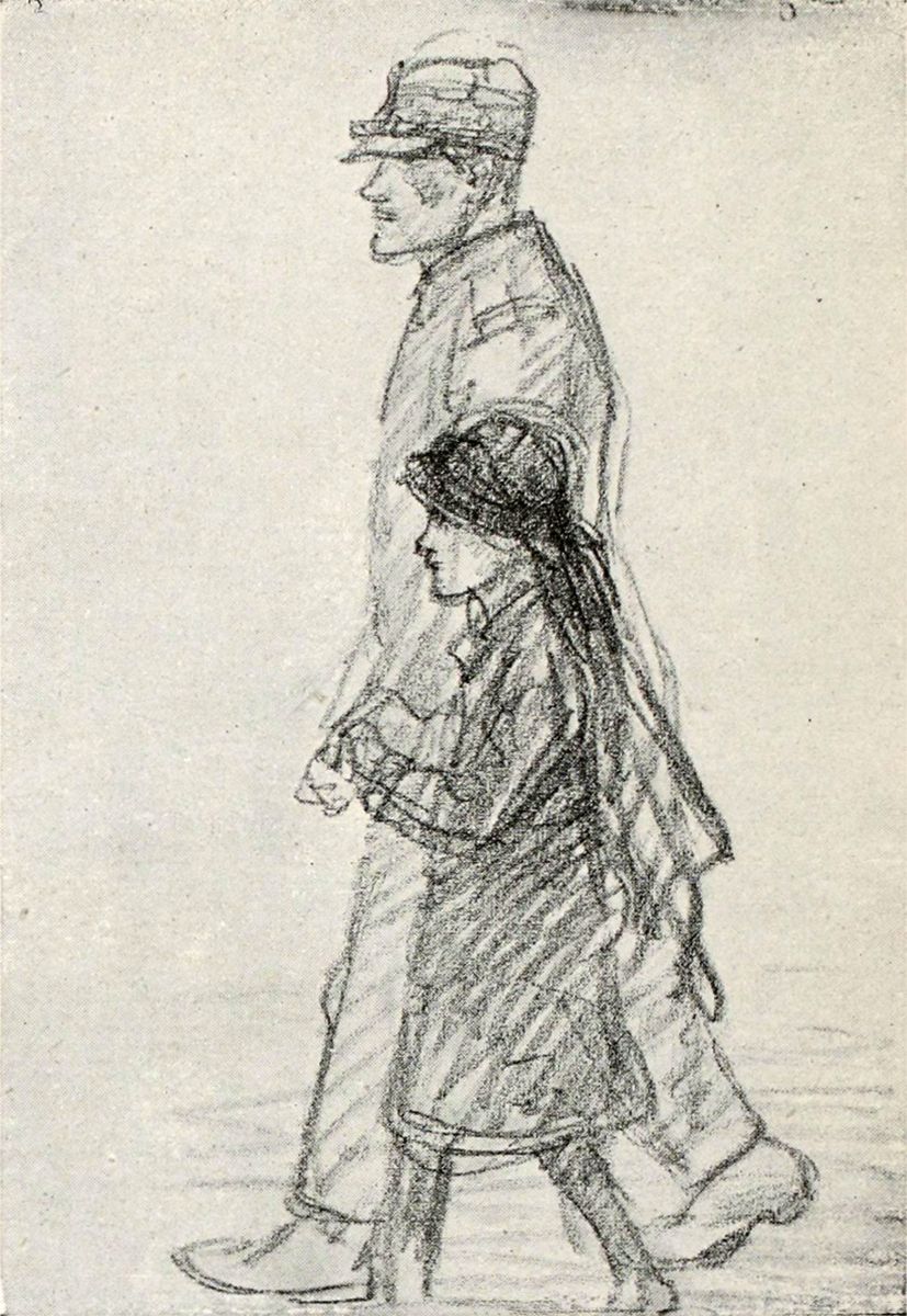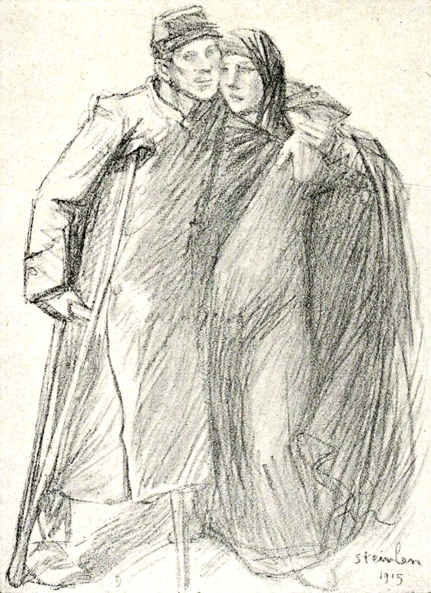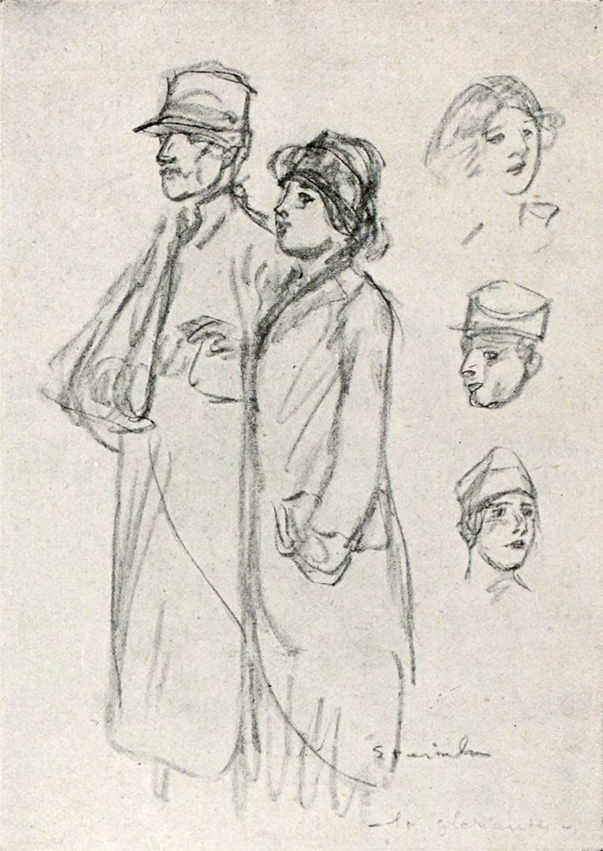 On ne décrit pas un tel art, car il est lui-même une synthèse de la description littéraire, et il faudrait s’arrêter à chaque croquis. J’essaie moins de suggérer l’œuvre que d’en définir les directions en rendant un juste hommage à celui qui, de toute la science de son beau métier et de toute la sincérité de son cœur profond, l’a réalisée. C’est encore un des caractères de cette conception si spéciale que la grande préséance donnée par Steinlen, en ses séries, aux femmes et aux enfants. Il y en a beaucoup plus que de soldats. Par-dessus tout, un chef-d’œuvre d’art, de grâce triste et d’amour: le convalescent infirme, la béquille sous un bras, s’appuyant de l’autre sur une jeune femme aux grands voiles. Rien ne rendra par des mots le modelé de ce jeune corps féminin sous les étoffes et les expressions de ces deux visages, et la technique miraculeusement simple, n’intervenant juste que pour signifier le sentiment. Que cela est donc beau! Courageuse est encore une chose admirable, montrant auprès du soldat prêt à partir, la femme fière, raidie, s’interdisant de pleurer. Et c’est une autre admirable chose, simplifiée à l’extrême, que ce dessin des Convalescents, deux jeunes soldats dont l’un se courbe, accablé, sur sa canne, tandis que l’autre, maigre et livide, défaille à demi, la face vers le ciel, le dos appuyé au mur de l’hôpital. C’est encore ici une œuvre où les limites de la poésie, du roman et de l’art du dessin ne sont plus discernables, où l’émotion emprunte tous les moyens pour s’imposer, où on ne pense pas à ces moyens, où l’idée seule compte. Ce n’est qu’après qu’on se demande comment c’est fait, et quelle magie sort de ce bout de papier crayonné, de cette note de carnet.