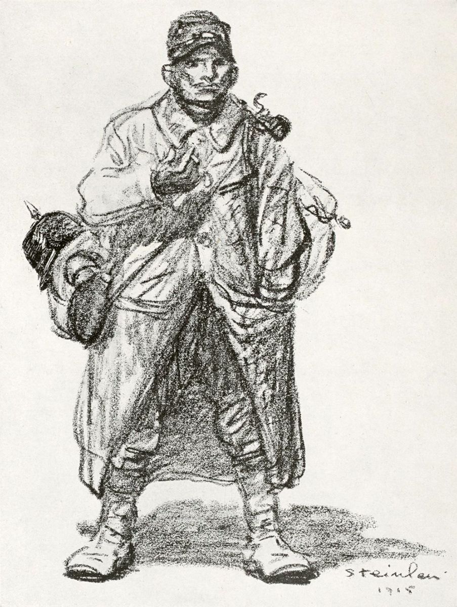 Resté en marge de toute école, de toute théorie, de toutes les tourmentes artistiques qui ont dévoyé récemment tant de talents et donné de l’importance à trop de maximalistes de la peinture, Steinlen est un grand observateur humain dont le cœur a parlé, dont le cœur a aimé ce que voyaient ses yeux, et qui, dans la vaste convulsion, est resté lui-même, plein de pitié clairvoyante. Il se sert magistralement des éléments naturels et éternels de son art, il suggère le sentiment par l’étude serrée puis largement synthétisée du visible, comme un Dickens du crayon: mais aussi avec une âpreté qui n’est point dans Dickens, une âpreté qui décèle la faculté d’indignation, sans laquelle la pitié n’est qu’une velléité inopérante. Toutes les haines sont restées en dehors de la conscience de cet homme à la voix douce, sauf la haine du Mal, et elle parle sourdement à travers ces dessins où il évoque les victimes, où les bourreaux sont invisibles et pourtant toujours présents. Et c’est pourquoi, dans cette guerre que nous faisons, et qui est la guerre faite au principe du Mal, une véritable croisade contre l’Antéchrist, l’artiste miséricordieux qu’est Steinlen est aussi un combattant.