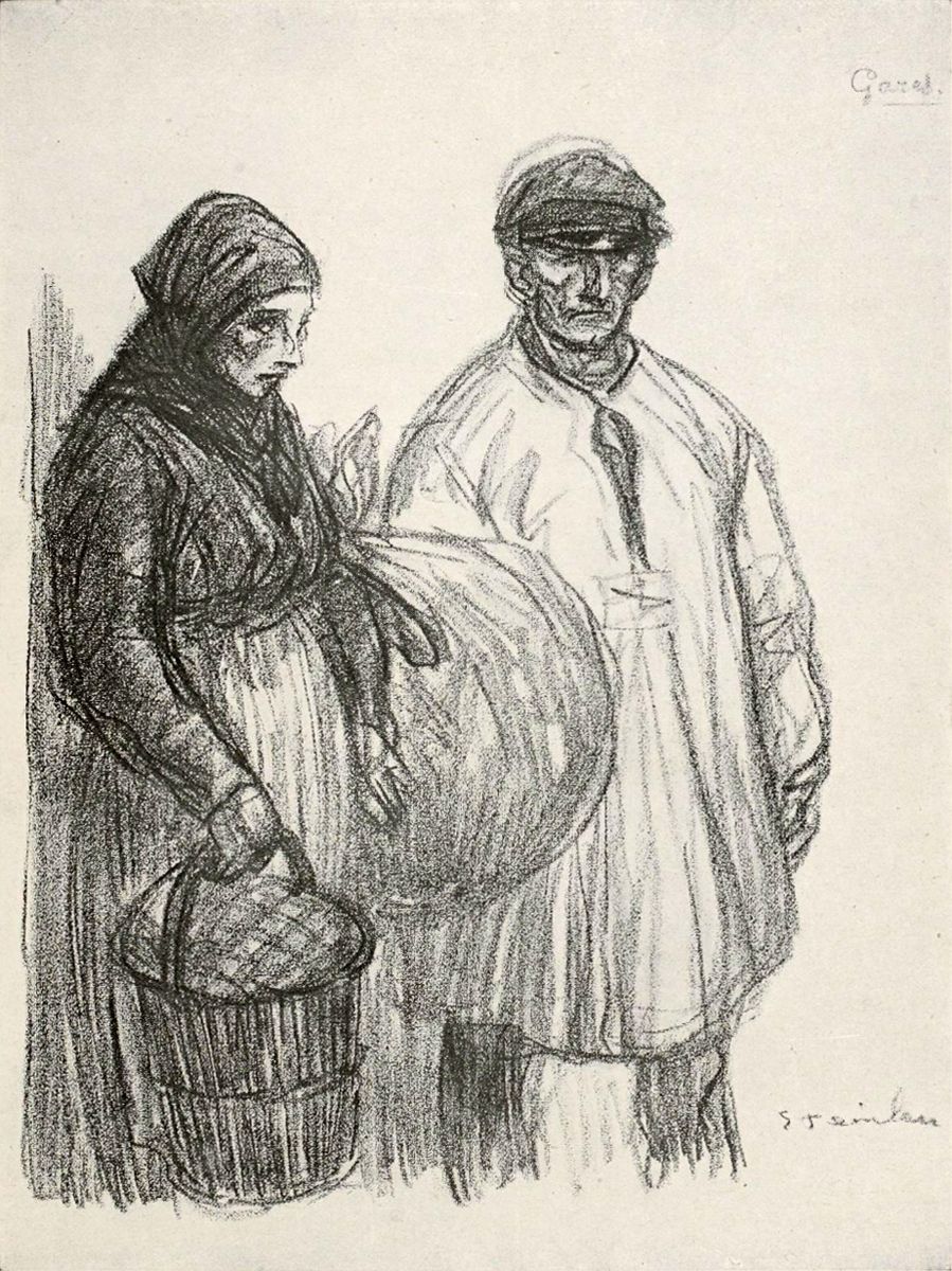 Steinlen a fait beaucoup de ses dessins dans les gares. Il y a là une grande poésie. Quand on veut affronter la douleur, et mesurer ce qu’en peut contenir sans se briser la pauvre enveloppe humaine, si périssable et si solide tout ensemble, il faut aller dans ces gares tumultueuses et mal éclairées où les permissionnaires disent adieu à leurs femmes et à leurs mioches. L’artiste méditatif peut saisir là les plus violentes expressions du pathétique: le poète peut s’y pencher sur les âmes, un regard les révèle jusqu’au tréfonds. Les génies de Baudelaire, de Carrière et de Rodin sont errants en ces lieux désolants et grandioses. On voit d’inouïes torsions de corps de femmes se donnant toutes, fières, sans fausse honte, dans un dernier baiser à celui qui repart vers la mort. On voit de ces créatures qui rient jusqu’à la seconde du départ et qui, brusquement, l’homme disparu dans le remous, s’affaissent en sanglotant sans lâcher la main de leur enfant hébété. On voit, sous un falot éclairant de vieilles affiches balnéaires déchirées, les faces blêmes des ouvrières qui se tendent vers le couloir d’où surgiront les poilus boueux, revenus du front; et chacune attend le sien, et l’affreux doute les tenaille toutes, et sous la poussée de leurs corps confondus la barrière craque. On entend des phrases qui arrachent les larmes, tout le monde se parle, il n’y a ni distances sociales ni scrupules, parce que tous et toutes viennent pour la même joie ou la même douleur devant ce grand trou noir du fond d’où, parmi la fumée, les feux rouges et verts, la pluie, la nuit, les grands trains impassibles déversent ou emportent des formes aimées. Cette triste beauté, Steinlen l’a pénétrée, et non pas en dilettante, en observateur sagace, froidement curieux, mais avant tout en homme au cœur fraternel; rien du décor et des gestes n’a échappé à son regard de peintre, mais surtout il a communié avec 30 ces foules. Dans le simple dessin d’un «pépère» étreignant sa pauvre compagne en un coin de corridor, il a mis toute la compassion et toute la tendresse, et il a dit autant par quelques traits de son crayon cursif qu’un romancier en bien des pages. Mais, même sans faire intervenir l’image du soldat, il a su évoquer tout le tragique quotidien de cette guerre; il lui a suffi de dessiner deux braves bourgeois verdunois, vieux, faibles et calmes, exilés assis sur un chariot à bagages près de leur petite valise, attendant d’aller où? avec une résignation infinie...