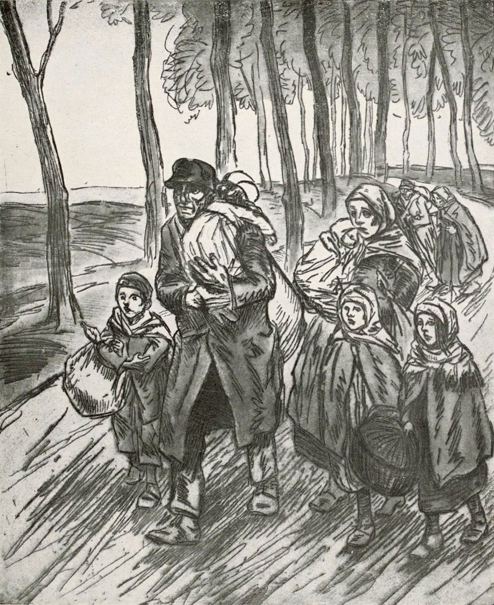 Steinlen, dans des camps de réfugiés, dans des centres d’évacuation, a dessiné des femmes et des enfants serbes, avec une force extraordinaire de caractère graphique: la fierté farouche, la mélancolie, la passivité de la race persécutée, massacrée et proscrite sont là tout entières. Steinlen a peint et dessiné, dans les wagons à bestiaux qu’éclaire un quinquet lamentable, le sommeil prostré des soldats recrus de lassitude, s’épaulant, offrant à la lueur trouble des masques ravinés, aux yeux gonflés, aux bouches tordues, béantes, pleines d’ombre. Il a peint, sur une route fangeuse, balayée par la rafale, le croisement des Deux Cortèges, celui des réfugiés qui cheminent avec leurs misérables hardes et celui des troupiers qui leur crient: «On les aura!» Il a vu et exprimé la paysanne et les gosses qui, navrés et stupéfaits, restent les bras ballants devant quelques pierres en murmurant: «C’est ici, chez nous!» Il a dressé, massive et sévère dans sa mante noire, la Vieille des Ruines, la petite bourgeoise respectable, correcte malgré tout avec sa capote et ses bandeaux plats, et dont toute la face est comme vitrifiée sous les larmes figées. Elle est au milieu des décombres, elle ne peut 33 même plus pleurer, elle n’a pas peur, rien ne l’intéresse, c’est une Niobé déjà insensibilisée dans la pierre, cette femme qui a tout souffert, tout vu, et que la mort physique a oubliée alors que son âme est morte depuis longtemps. Ah! Steinlen ne nous montre ni cavaliers, ni batteries, ni charges à la baïonnette, ni drapeaux, ni éclatements d’obus, et la formule de jadis est bien finie, mais comme il nous l’évoque tout de même, la guerre!