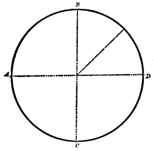 A circle is a figure comprehended by a single curve line, called its circumference, every part of which is equally distant from a point called the center. From a to b will be found the left, or convex, and from c to d the right, or concave curve. The whole may be made by a quick movement of the hand, with crayon, on the black-board, thus: Turn your right side to the board, place the crayon at the bottom, c, and with the elbow as the radius, carry the crayon toward the left from c to a, and so on until you reach the starting point, c, again, moving the hand at as rapid a rate as is possible.