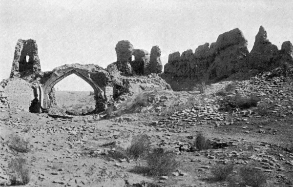 682 Three have been identified—Giaur Kal`a, Sultan Sanjar, and Bahrām `Alī. Some entrenchments are fabled to represent a fourth, older than the rest, built by Alexander the Great. But, as is well known, Iskandar Zū-l-Karnayn, “Alexander the Two-horned,” shares with Tīmūr and the Amīr `Abdullah the credit of having built nearly everything worth seeing in Central Asia.