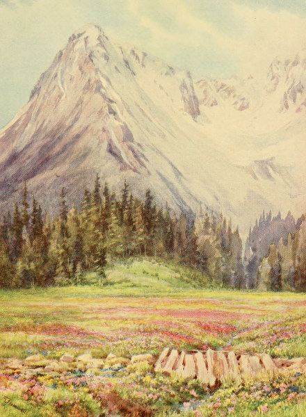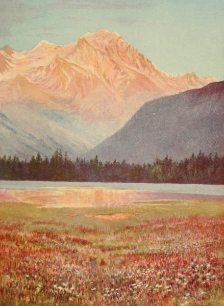 Alpine Flower-fields; it is well that we should at once come to some understanding as to the term “Alpine” and what it is here intended to convey, otherwise it will be open to misinterpretation. Purists in the use of words will be nearer to our present meaning than they who have in mind the modern and general acceptation of the words “Alp” and “Alpine.” The authority of custom has confirmed these words in what, really, is faulty usage. “Alp” really means a mountain pasturage, and its original use, traceable for more than a thousand years, relates to any part of a mountain where the cattle can graze. It does [Pg 13] not mean merely the snow-clad summit of some important mountain. Nor does “Alpine” mean that region of a mountain which is above the tree-limit.