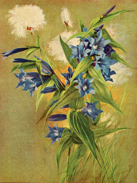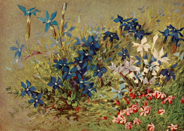 After some three months spent in intimacy with these slopes and fields, go down to the swallow’s summer quarters—to Martigny, or elsewhere on the plain—and mark the Zinnias and French Marigolds, Asters and Sweet-Williams, and the flaming beds of Petunias, Salvias, and Geraniums. Mark how gross seems all this “cultivation” after the Alpine wildness. You are at once constrained to ask yourself. What is there derogatory in wildness if to be cultivated is to be as these garden flowers? You see at once more clearly than possibly you ever saw before that, after all, refinement is largely a relative quantity, and that even the Rose, Dean Hole’s “Queen Rosa,” can appear coarse after you have spent a season with the Gentian.