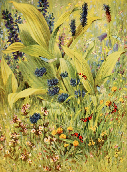 And this interest means more than mere pleasure, [Pg 186] more than a superficial tickling of the senses. It entails a mint of meaning for the soul. Yes, the soul. No gardener, no Nature-lover, need be shy of admitting he has a soul; for it is precisely this which makes Nature-lovers of us all, precisely this which plays so big a part in our admiration of the fields. “Breathes there a man with soul so dead” who will not linger lovingly over mountain meadows tossed or rolling like a multi-coloured sea, with sunlight playing amid the blues, mauves, reds, and yellows, breaking these into endless intermediary tints; and with butterflies seemingly in such light-hearted flight, skipping and flitting blithely, airily, for all the world like flowers come suddenly to sentient life? Breathes there a man who will not find in these meadows and their teeming gaiety “a vitalising passion, calling to life the shrouded thoughts and unsuspected forces of the heart”?