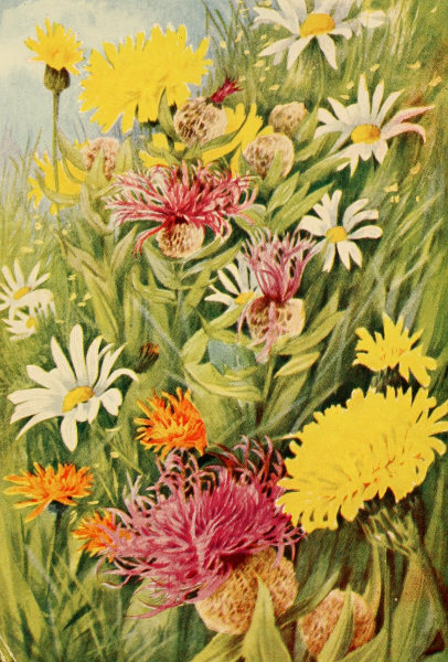 If June be reckoned as a millionaire, then surely July must also, and with the additional prefix “multi”! “It is with flowers as with men,” says Major Reginald Rankin in “The Royal Ordering of Gardens,” and “Providence is on the side of big battalions.” And, of a truth, this is so in these fields; bigger battalions it would indeed be hard to find. Is there not here some striking suggestion of an element in ultimate beauty—that of an harmonious brotherhood? One certainly seems to catch a glimpse of that economic state where individuality is general rather than particular; where personality is absorbed by the mass, and beauty is conspicuous only in the whole; where, so to speak, the red neckties of leadership do not flare out in designed and conscious isolation. Among themselves plants have their likes and dislikes. It is well known that, for example, certain flowers are only found in the company of [Pg 118] Corn, and it is said that in the kitchen-garden the Radish simply detests the Thyme. But here, on these meadows, all trace of discord seems lost in one great accord, and the plants, both great and small, blue-blooded and plebeian,