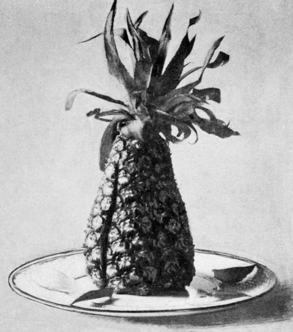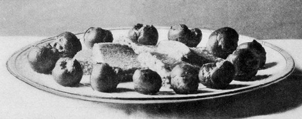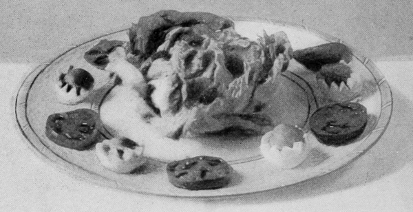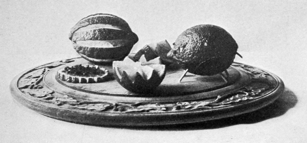 Lemons, like parsley, have convenience to recommend them, and, like watercress, are acceptable with fried meats. The acid of lemon is the best condiment for veal. When they serve the double purpose of garnish and condiment, they should be cut so the pieces can be taken in the hand and pressed without soiling the fingers. This is effected by cutting them in quarters lengthwise, or in halves and then in quarters. In some instances a half lemon is not too much to serve with one portion, but ordinarily quarters are sufficient. Slices are useless with meats, except as ornaments. Illustration No. 1 shows a 16lemon ready to be sliced. It has been channeled so as to give the notched edges which make the slices more ornamental. The illustration also shows a lemon made to simulate a pig. This form can be used with propriety on a ham or pork dish. The ears are formed by cutting and raising a triangular slice on each side of the pointed end, the eyes are made of cloves, the legs and tail of wooden toothpicks.