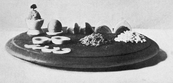 7. Strips of the white of a hard boiled egg arranged in a circle, the whole yolk placed in the center. The white is cut lengthwise of the egg, the strips pointed at the ends and sliced so they will lie flat. A small slice is taken off the yolk to make it stand firm.
