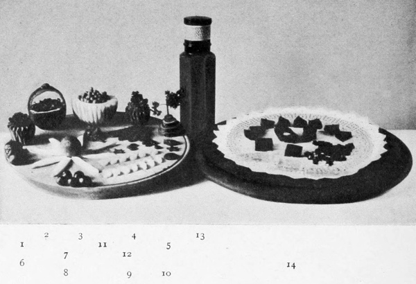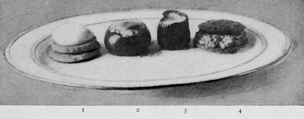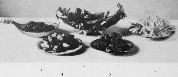 Pickled beets are a useful and effective garnish. The color gives decided contrast, and the flavor is a good relish. Sliced beets can be stamped with vegetable-cutters into fancy shapes, or cut with a knife into diamonds, cubes, or strips. One can easily have them always at hand. Two or three boiled beets sliced thin and put into vinegar will last until all are used, and should be among the stores in the dresser awaiting the convenience of the cook. Cucumber pickles and gherkins are equally useful in point of color effects, and in giving piquancy to many foods. They are used in slices stamped into fancy shapes, or chopped and arranged in lines or in little heaps. Gherkins are usually left whole, but may be sliced, 17giving buttons of color. Capers and olives complete the list of condiment garnishes, though any pickle may be used with propriety on cold meat dishes. Illustration No. 3 shows various garnishes as explained in legend.