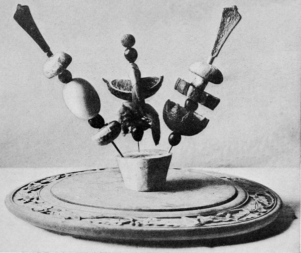 A large table is more imposing with high centerpieces, and at buffet luncheons high decorations can be indulged in. The cold dishes used on such occasions 6are susceptible of much garnishing, and are made to form a part of the decoration.