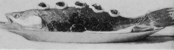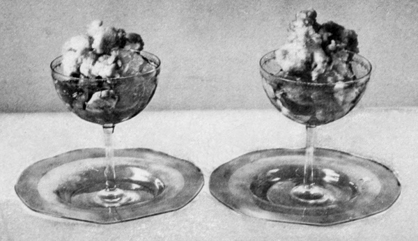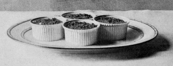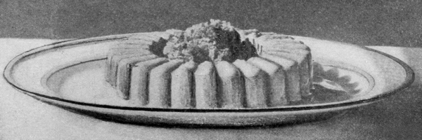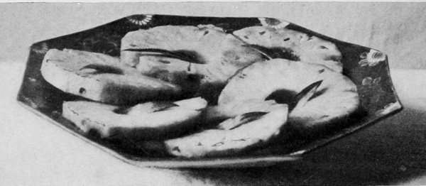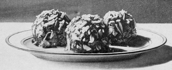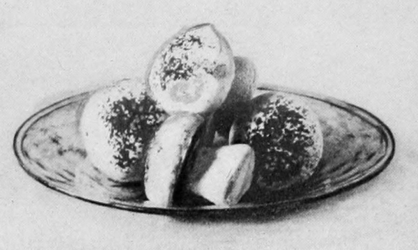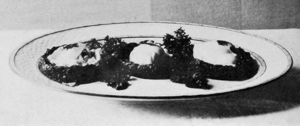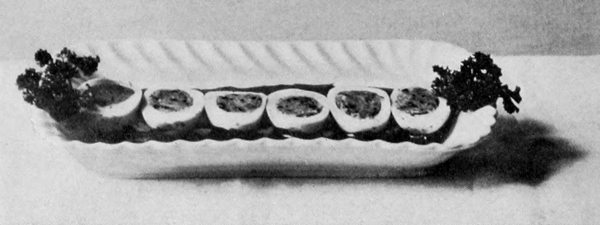 Hard-boiled eggs ornament in a variety of ways. They should be boiled very hard, then cut with a thin, sharp knife so the slices will be smooth and the edges clean. Illustration No. 2 shows plain slices, rings made by slipping the yolk out of slices, an egg cut into quarters and eighths, a whole yolk set into a ring, and a stuffed egg. Yolks pressed through a colander and sprinkled over creamed meat and fish dishes, cream toast, and some other dishes make a beautiful golden covering. Chopped whites in conjunction with crumbed yolks are used for tracing designs over salads, minces, and cold pieces.