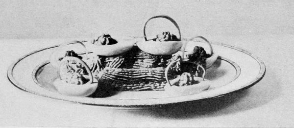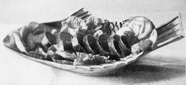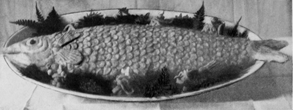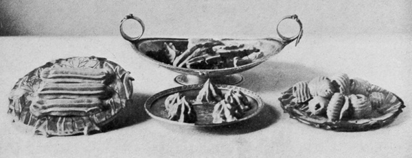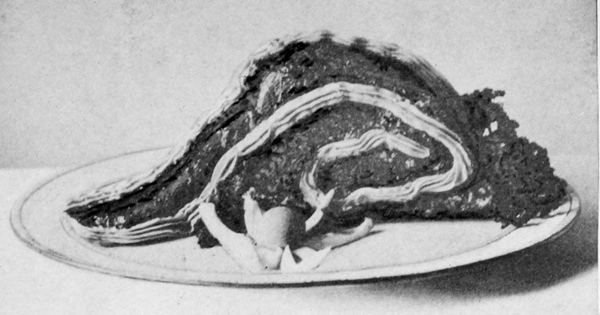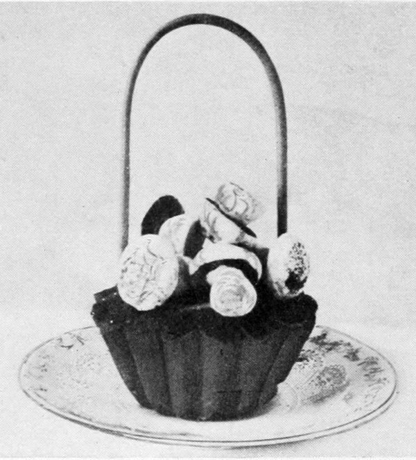 There is nothing which so quickly indicates the grade of the cook as the manner in which she serves her dishes. One who has no pride in her work seldom takes time for ornamentation, though garnishing is the simplest part of her duty. When, however, attention is given to this branch, even though the result may not be perfect, it gives promise of better things, and one may confidently predict for the cook who thus shows desire to do well that she will attain a higher degree of excellence in her profession. There is no class of dishes, from breads to desserts, which are not more appetizing when made attractive in appearance. It has been said that “eyes do half the eating,” and as no expense need be incurred in the indulgence of tasteful arrangement of the dishes, there seems to be no reason why the simplest table 9should not share with the most expensive one this element of success. Care, taste, and ingenuity will do much to remedy the lack of money, and may change the standard of the table from coarseness to refinement. Many suggestions for decorations may be found in the show-windows of bakers, pastry-cooks, fishmongers, and of delicatessen shops. Many of the pieces displayed there may seem elaborate and difficult to the novice, but they are, in reality, simple enough when the use of materials is understood.