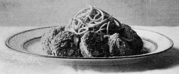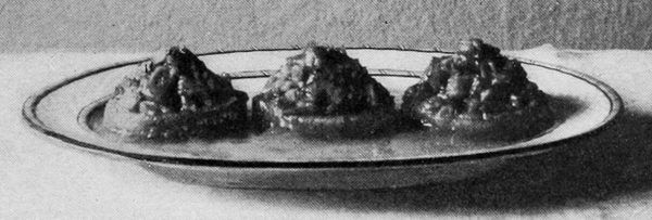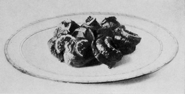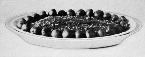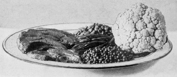 Vegetables as garnishes come next in order of suitableness and convenience. When vegetables are placed on the same platter with meats, they not only 13ornament the dish, but contribute to the ease of serving a dinner. When they are used the dish is called à la jardinière or à la printanière. Probably every cook knows how to serve mashed or fried potatoes or green peas in the center of a circle of chops. Similar combinations can be made in various ways and of many things. Spinach, beans, carrots, purées, macaroni, spaghetti, or rice may be placed so as to form a base, raising the chops like a crown, or grouped with them in rows, or alternating with the individual pieces. Macedoine is a mixture of any number of vegetables, such as peas, beans of various kinds, carrot and turnip balls, flowers of cauliflower and any other vegetable obtainable. They may be mixed together, or each vegetable may be kept distinct and placed in small piles around the platter. Small portions of vegetables left over may be used to advantage in this way. Very little need be used of any one, and any number may be combined on the same dish. Potatoes boiled or fried can be prepared in many fancy ways to make them suitable for garnishing. Well-seasoned spinach is excellent with chops, steaks, or roasts. Browned onions are often used. Meats with onion garnishes make dishes called à la soubise. Brussels sprouts, hot, are a suitable garnish for corned beef; or cold, with a French dressing, are an excellent salad to serve with cold beef. They should not be over-cooked or they will lose their shape. Stuffed tomatoes may be used with almost any meat dish.