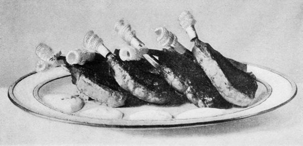 Rice is generally used for borders which are intended to keep creamed dishes and fricassees in shape. Sausages cut in halves or quarters, or fried bacon, make a good relish as well as a garnish for many meats; they are particularly good with egg dishes. Paper frills on protruding bones serve the excellent purpose of concealing these unsightly ends. They are easily made by folding a strip of paper lengthwise, then cutting it down about one and a half inches at intervals of one-eighth inch on the folded side, thus making a double fringe; next slip one side up a little, making the fringe round out; and, finally, roll this around a stick, leaving the 15openwork in a close spiral. These frills are used on the bones of a leg of mutton, on ham, on chops, and on drumsticks.