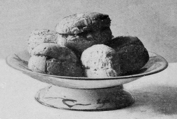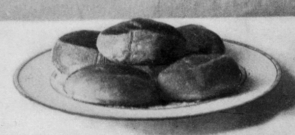 For these rolls, any bread dough may be used. In order to get the pieces of uniform size, mold the dough into a roll about one and a half inches in diameter. Cut the roll into pieces one and a half inches long, giving pieces the size of an egg, or make the pieces larger, if desired. Turn each piece into a ball, and then, using both hands, roll it into shape, making a roll which is thick in the center and pointed at each end. See illustration No. 196.