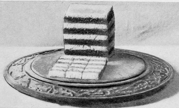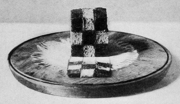 Cut, one inch thick, three slices each of white and of brown bread. Spread a slice of the white bread with a thick layer of soft butter. Lay on it a buttered slice of brown bread, placing the buttered sides together. Cover the top of the brown slice with butter, and lay on it a buttered slice 205of white bread, the buttered sides together. You have now three layers of bread, with the brown slice in the middle. Repeat the operation, reversing the order of the white and brown slices. Trim the two piles evenly, and place them in the ice-box under a light pressure. When the butter is well hardened, cut slices an inch thick from the ends of both piles. Butter these slices as before, placing two buttered sides together, and arrange them so that the colors will alternate in squares.