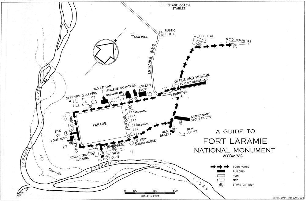 At Fort Laramie, the National Park Service is endeavoring to preserve the surviving features of the military period and, after exhaustive research, to restore standing buildings and related portions of the grounds to their appearance around 1888. Certain of the older structures provide glimpses of the fort scene as early as 1849.