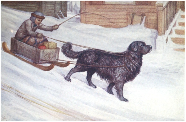 The Newfoundland dog is known and loved all over the world, and he is deserving of that popularity and esteem. What a noble and gentle animal he is, with his soft, brown, sympathetic eyes, shining black coat, strong-set legs, and commanding head! How the children love him! And how he loves the children! It is a common sight to see him harnessed, drawing a small cart in which is seated a little child. You can tell by the joyous wag of his tail, and his proud walk, that he appreciates the task of drawing his infant queen through the country lanes when she is taking her morning constitutional. In the winter-time he enters fully into the pastimes of the boys and girls, and enjoys a frolic in the snow just as much as they. When the lakes are frozen over, and the snow lies hard upon the ground, “Bobby” is harnessed to a little sleigh, and off he bounds with a heart as light as air, drawing his little chum to the music of the bells that dangle round his glossy neck.