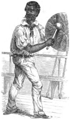 "It consists of a bucket of water, and the half of a cocoa-nut shell. There is a tiny hole like the prick of a needle in the bottom of the shell, and when you put it on the water you can just see a stream like a thread spurting up. It takes an hour to fill the shell, and when it is full it goes plump to the bottom of the bucket, making a bubbling noise that attracts[Pg 438] the attention of the man on duty, who immediately puts the shell in place again. I used to try it with my watch, and found that it never varied more than a minute from the hour, which is quite accurate enough for an Oriental. The motion of the boat had no effect on it, as the water in the bucket was always on a level.