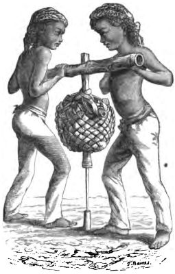 "The dry powder is then washed, and strained through a coarse sieve;[Pg 442] the water flows into a deep trough with a depression in the centre, where the sago sinks to the bottom and is secured. It is then pressed into cylinders weighing about thirty pounds each, or it is baked into cakes in a clay oven, with a series of compartments an inch wide, and six inches long and deep. The cakes will keep a long while if they are dried in the sun after baking. I have eaten sago that was said to be ten years old, and found it perfectly good."