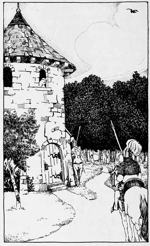 On the sixth day Williswind was sitting at the window, watching eagerly for the bird’s return. Suddenly she saw the figure of a knight come from the thicket. As she looked at him, she saw that it was not the robber knight; his armor was entirely different. Hope came to her at once, and she called out loudly and waved her handkerchief through the bars.