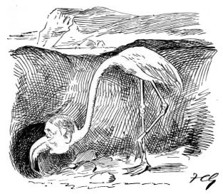 Alice followed the direction of its glance and noticed for the first time a figure sitting in a very uncomfortable attitude on nothing in particular. Alice had no time to wonder how it managed to do it, she was busy taking in the appearance of the creature, which was something like a badly-written note of interrogation and something like a guillemot, and seemed to have been trying to preen its rather untidy plumage with whitewash. “What a dreadful mess it’s in!” she remarked, after gazing at it for a few moments in silence. “What is it, and why is it here?”