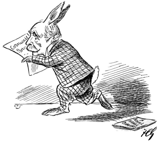 “A rhyme for Cornwall,” said the Rabbit, as if in answer to her thought; “borne well, yawn well”—and he pattered away into the distance, dropping in his hurry a folded paper that he had been carrying.